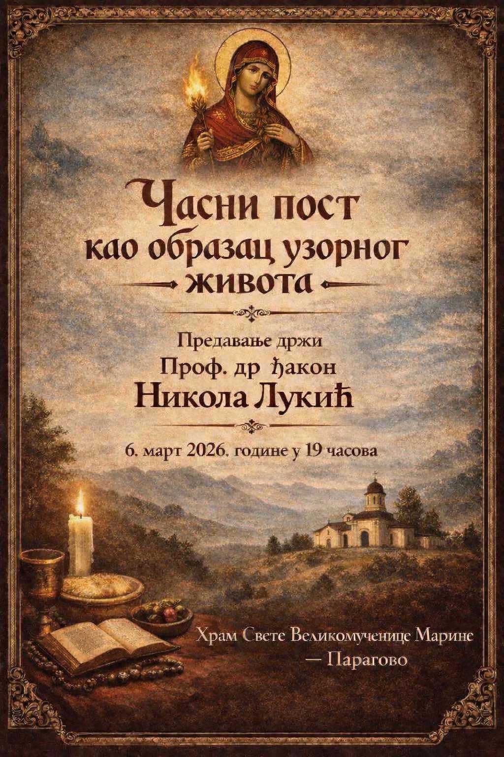 - Предавање: Часни пост као образац узорног живота, петак 6. март, 19ч